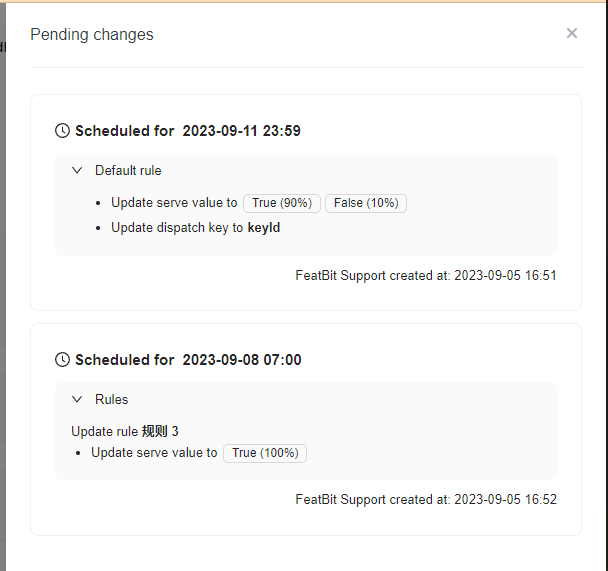 1. To view the complete list of changes, click on the clock icon. A panel appears that displays all the pending changes that are scheduled for this flag. The changes are listed chronologically, with the earliest upcoming change listed first:\