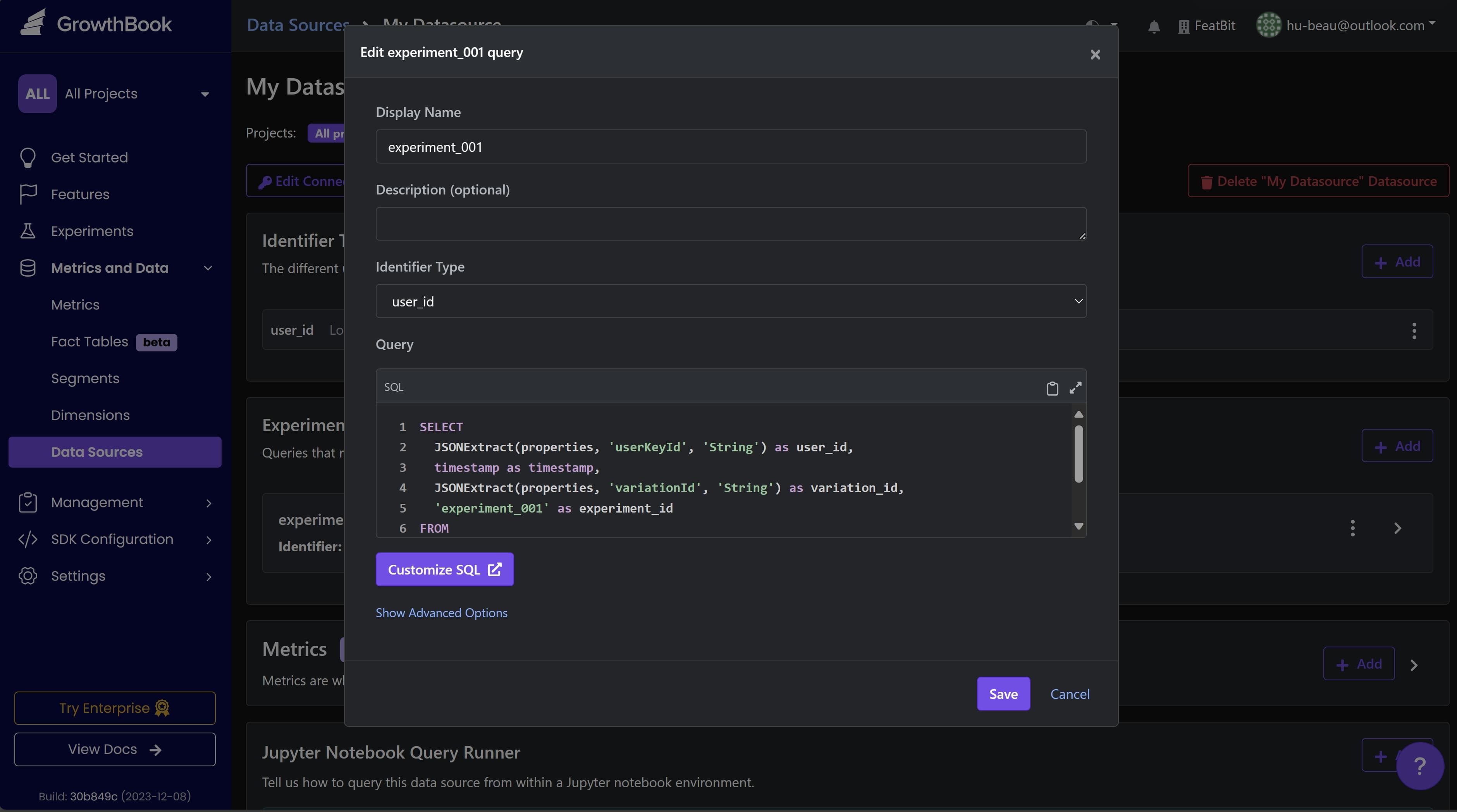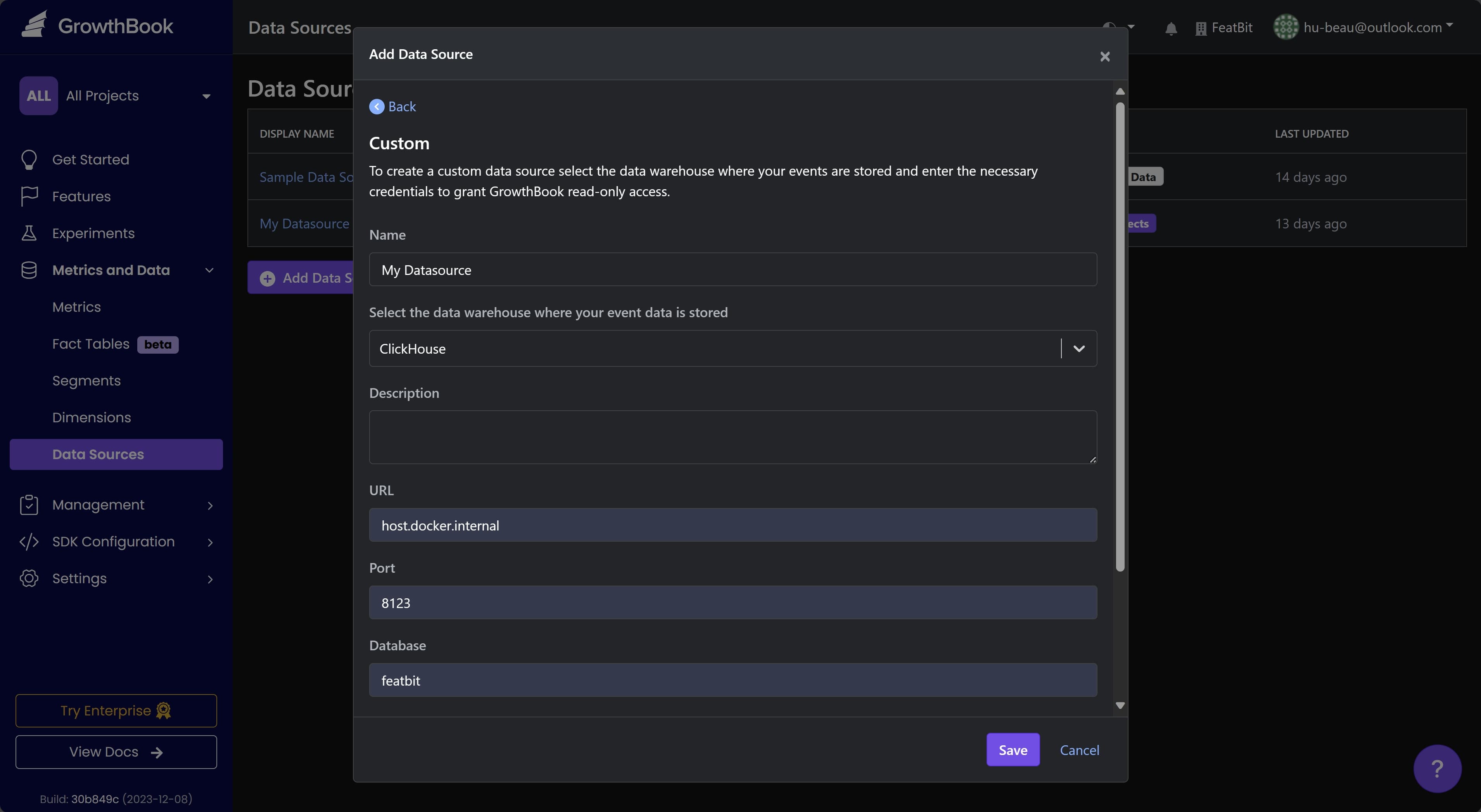 FeatBit uses ClickHouse as the data store for its Pro version. In Growthbook, you can connect to it using the following settings: