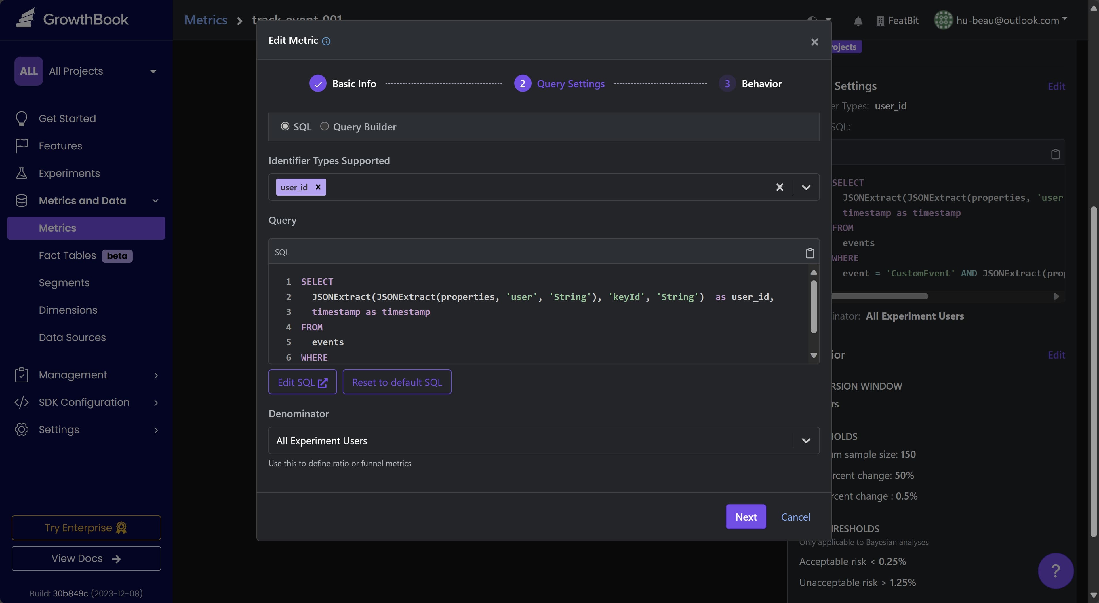 Select the Data Source you created earlier. Growthbook will then automatically load the experiment assignment queries and metrics you have previously set up. Click the Import button.